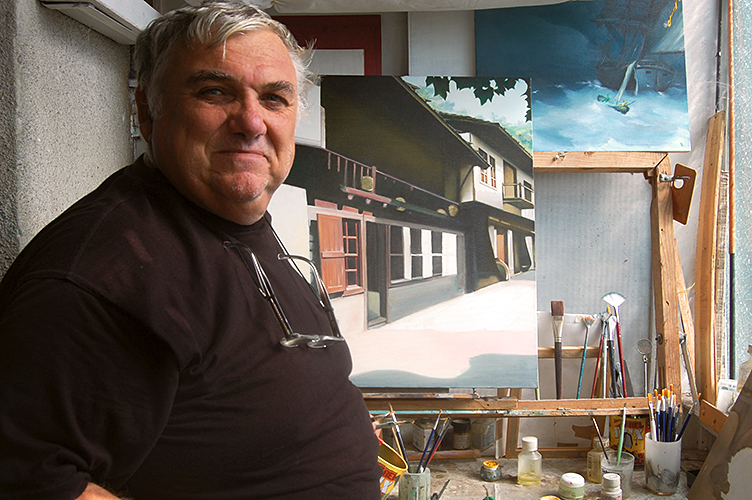 He is working mostly in the style of realism and exclusively oils on canvas, wooden board or cellulose plates. His favorite subjects are the sea, countryside landscapes and scenes from the Bible. He has many years experience in sailing and this makes seascapes his most favorite.